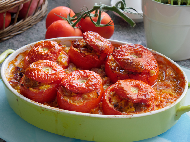 7. Ψήνουμε σε προθερμασμένο φούρνο στους 180°C για περίπου 1 ώρα, μέχρι να μαλακώσουν οι ντομάτες και να πάρουν ωραίο χρώμα.
